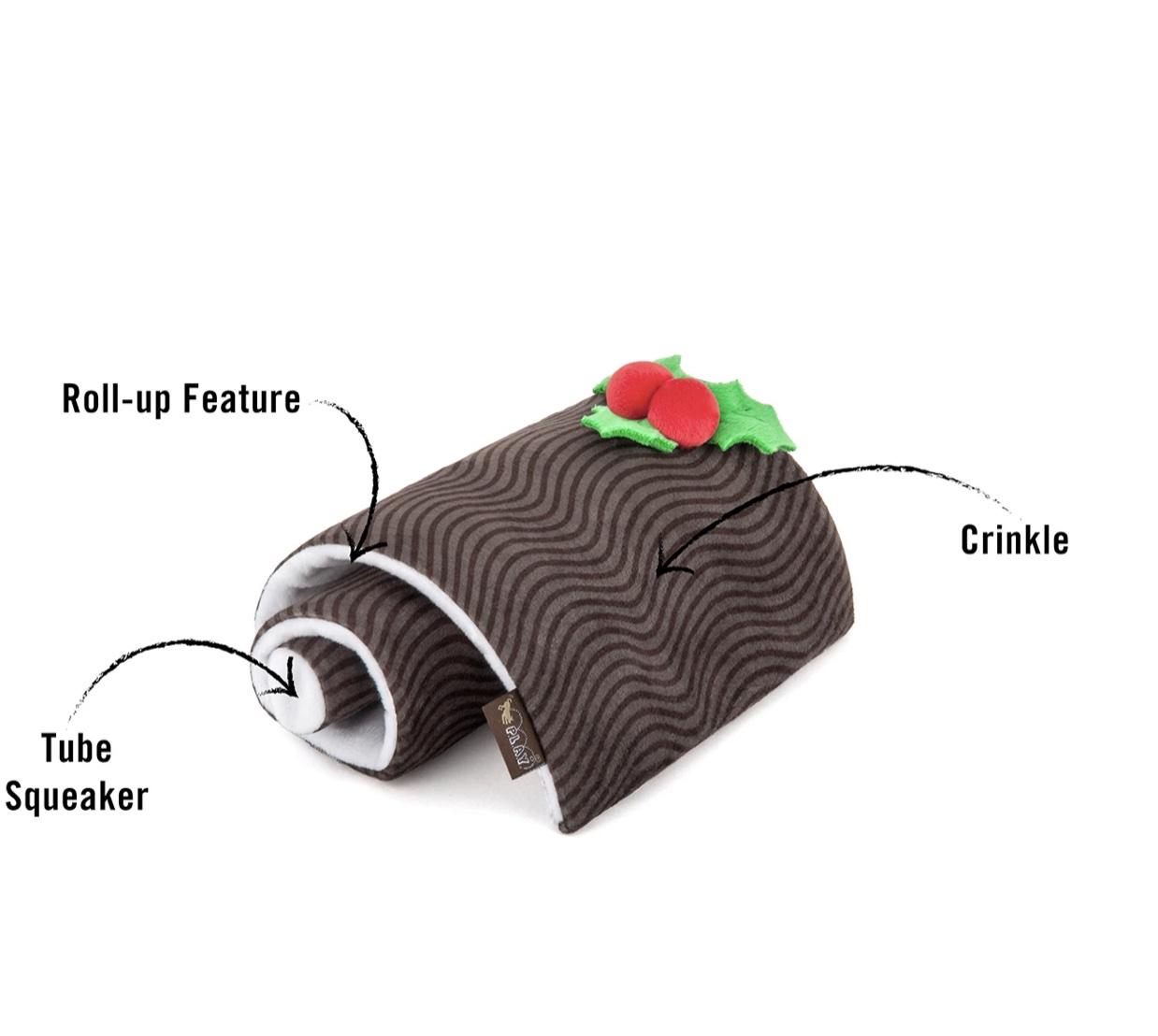 Cette bûche au chocolat se dérouler et son tissus garnis en bouteille plastique recyclée fait un bruit de papier froissé . Également doté d’un pouet .