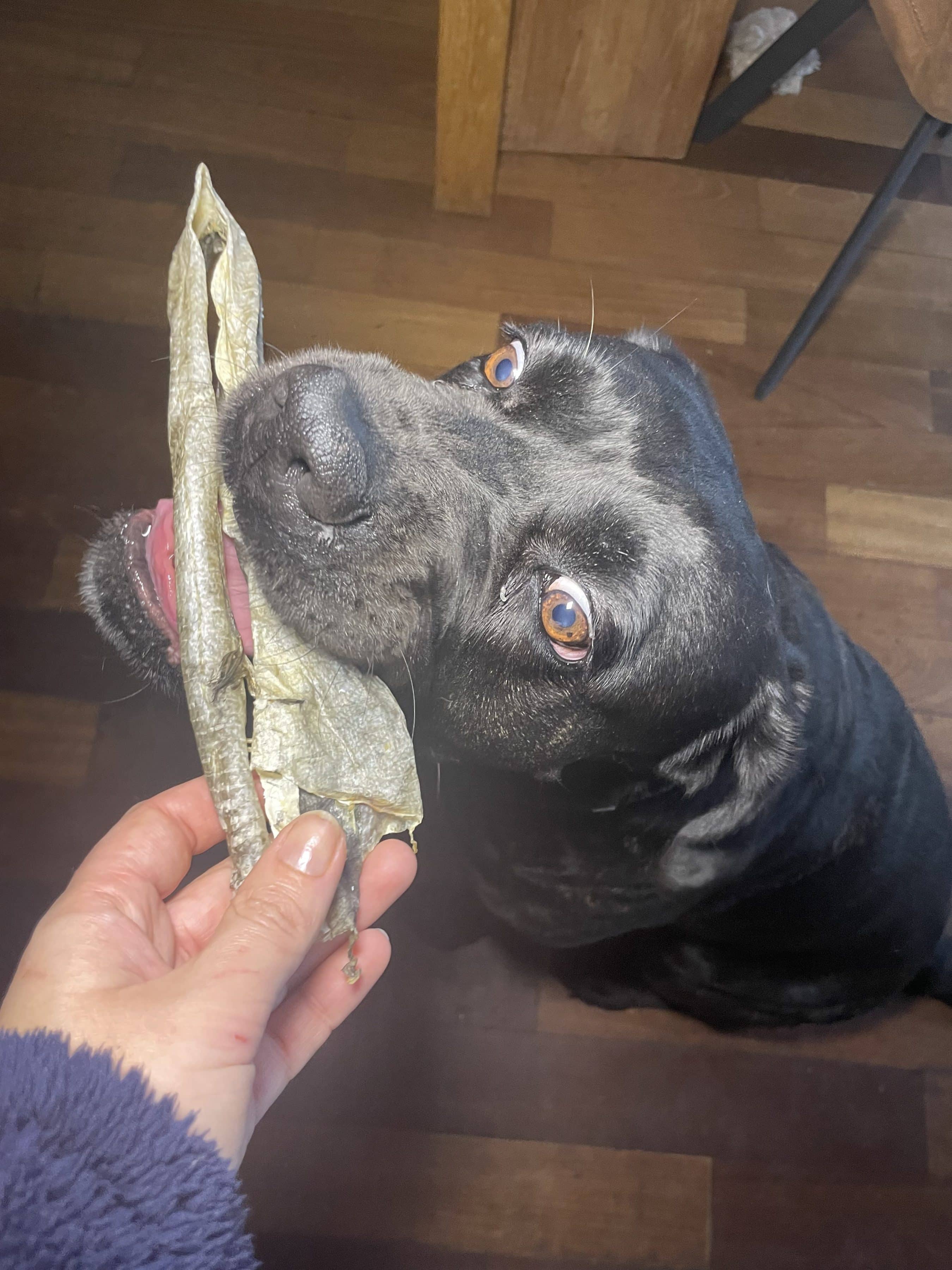 Offrez à votre chien le plaisir de savourer une friandise saine et délicieuse avec les lanières de peau de cabillaud ! 🐾🐟