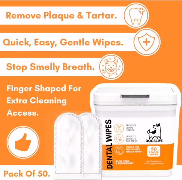 FIFTY lingettes pour dents de chien ! Notre très grand paquet de tampons de nettoyage des dents est conçu pour une utilisation régulière, afin que vous puissiez garder la bouche de votre chien plus longtemps !