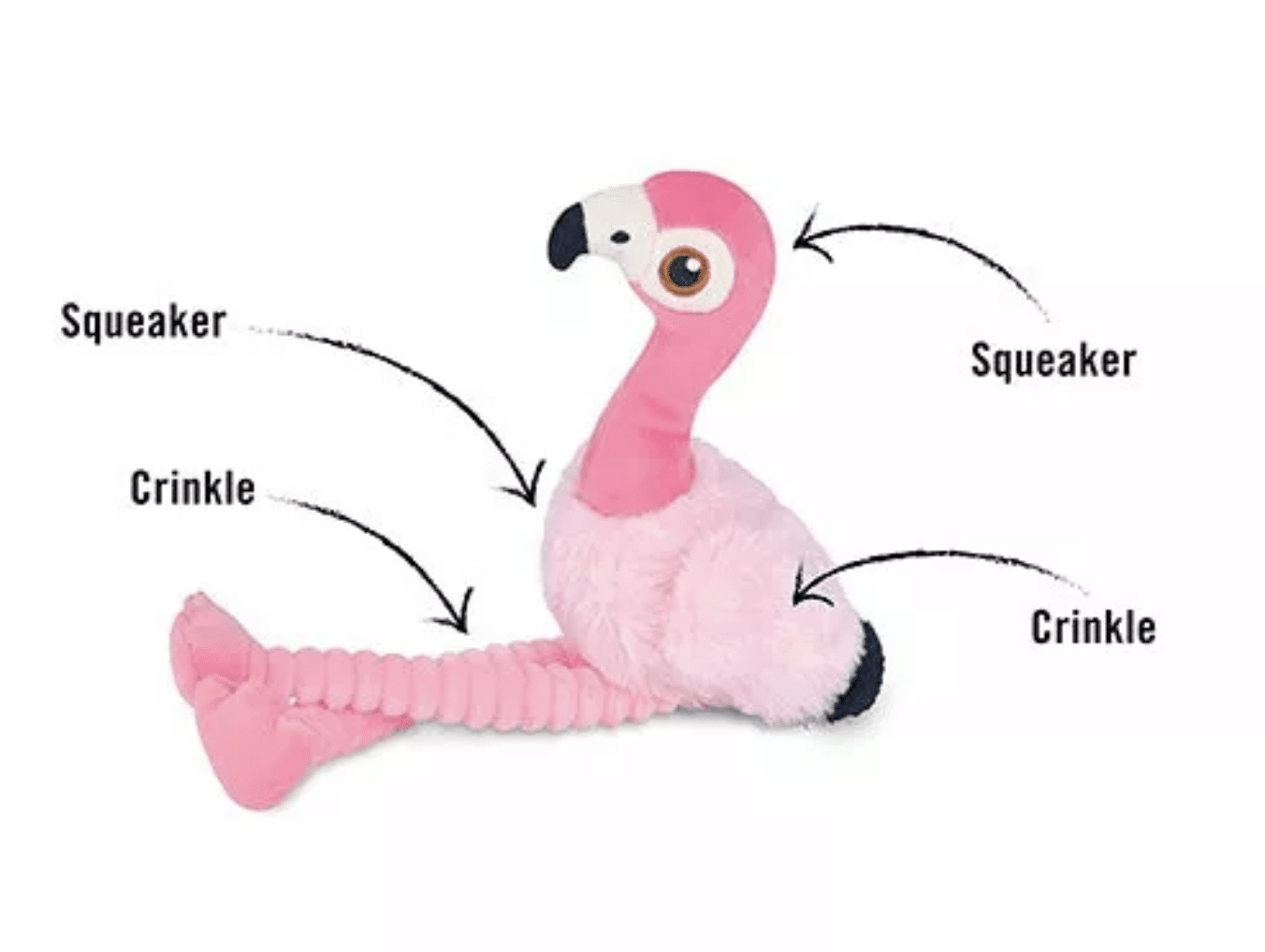 La peluche pour chien en forme flamand rose de Pet Play couine légèrement pour stimuler votre chien pendant le jeu. Le papier sonore à l’intérieur stimulera votre chien pour des heures et des heures.