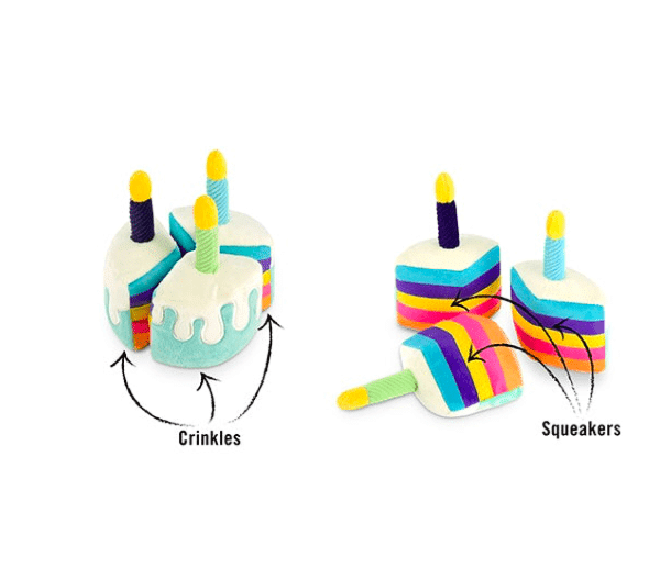 Un vrai gâteau d’anniversaire avec les bougies, le glaçage et en plus si votre chien est partageur, il se divise en 3 parts qui font pouet pour une partie de jeu endiablée avec les copinous !