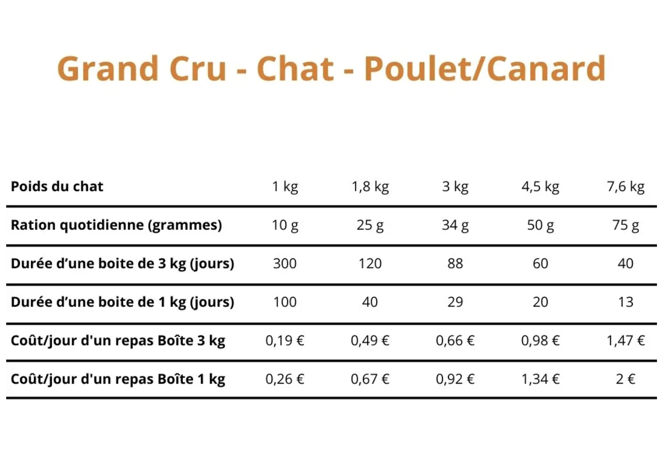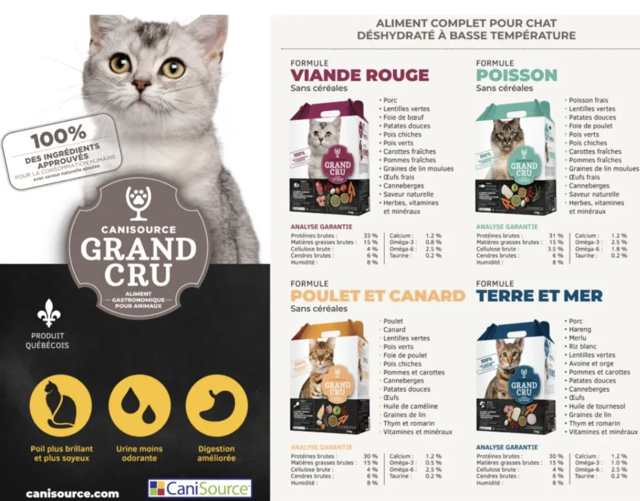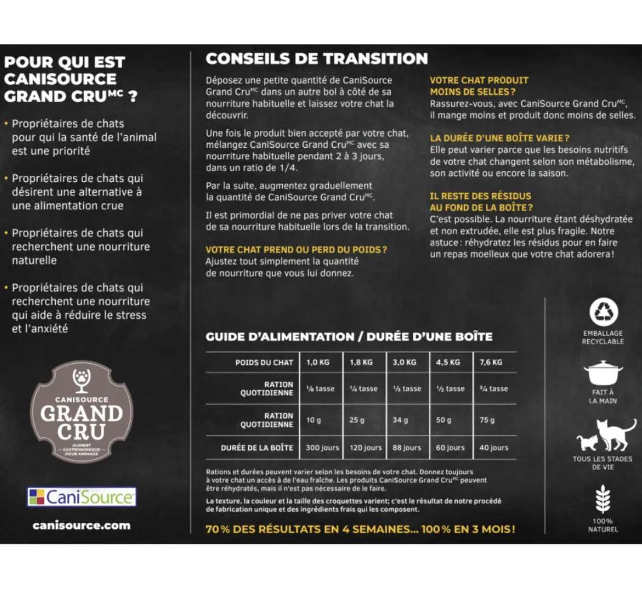 Rations et durées peuvent varier selon les besoins de votre chat. Donnez toujours à votre chat un accès à de l’eau fraiche. Les produits CaniSource Grand Cru peuvent être réhydratés, mais il n’est pas nécessaire de le faire. La texture, la couleur et la taille des croquettes varient; c’est le résultat de notre procédé de fabrication unique et des ingrédients frais qui les composent.