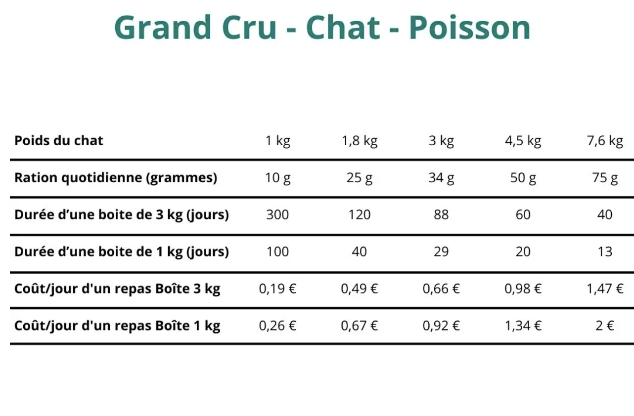 Rations et durées peuvent varier selon les besoins de votre chat. Donnez toujours à votre chat un accès à de l’eau fraiche. Les produits CaniSource Grand Cru peuvent être réhydratés, mais il n’est pas nécessaire de le faire. La texture, la couleur et la taille des croquettes varient; c’est le résultat de notre procédé de fabrication unique et des ingrédients frais qui les composent.