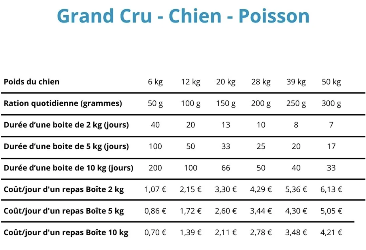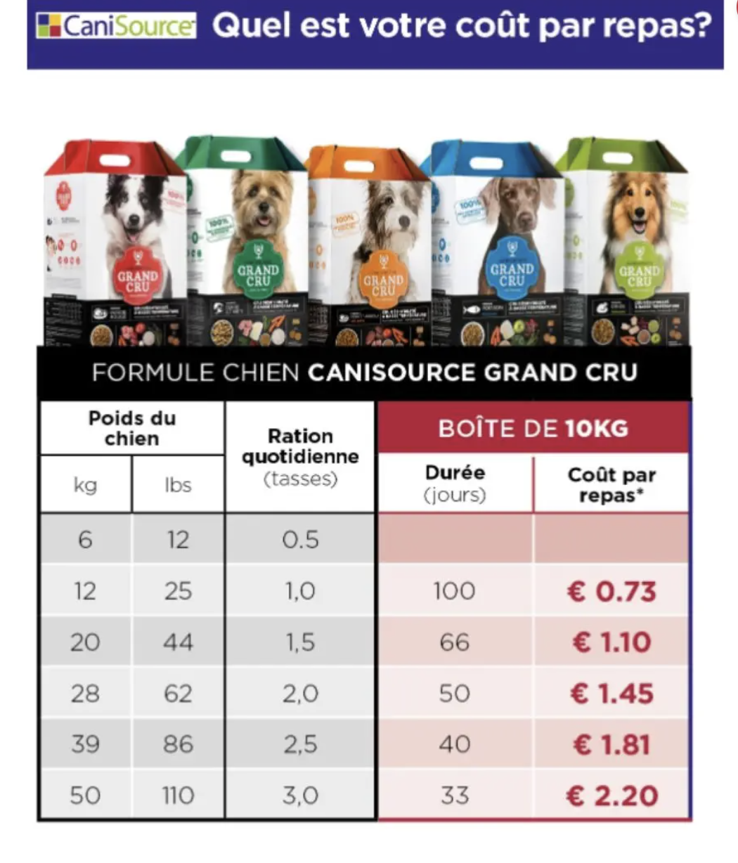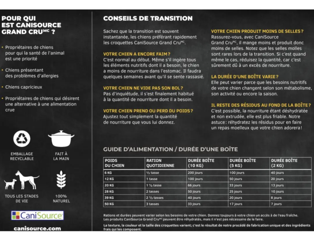 Ces quantités ne sont données qu’à titre indicatif et peuvent varier selon les besoins de votre chien. Votre chien devrait toujours avoir accès à de l’eau fraiche. CaniSource Grand Cru peut être réhydratée, mais il n’est pas obligatoire de le faire. La texture, la couleur et la grosseur des croquettes varient et c’est normal: c’est le résultat de notre procédé de fabrication unique et de l’utilisation d’ingrédients frais!